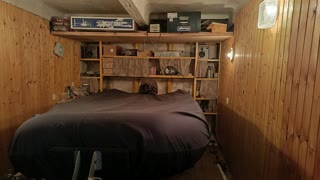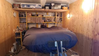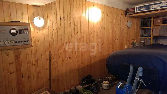 В гараже утепленная яма по всему периметру, смотровая по центру, имеются стеллажи, полки и рабочий стол.